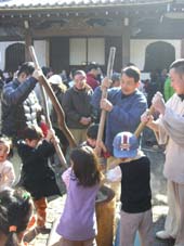 朝から搗きだして、全部で18臼。次の日腕が上がらなかったお父さんもいるのではないでしょうか。ご好評につき今年も実施した「ミニ鏡餅を作ろう」では、こどもたちはみんな洋服を真っ白にしながらつきたてのお餅をまるめていました。来年はエプロンなど持参して頂くといいかもしれませんね。一人ずつ杵でお餅を搗き、からみ餅をたくさん食べ、お腹が満足すると子供たちは散らばって遊び始めました。