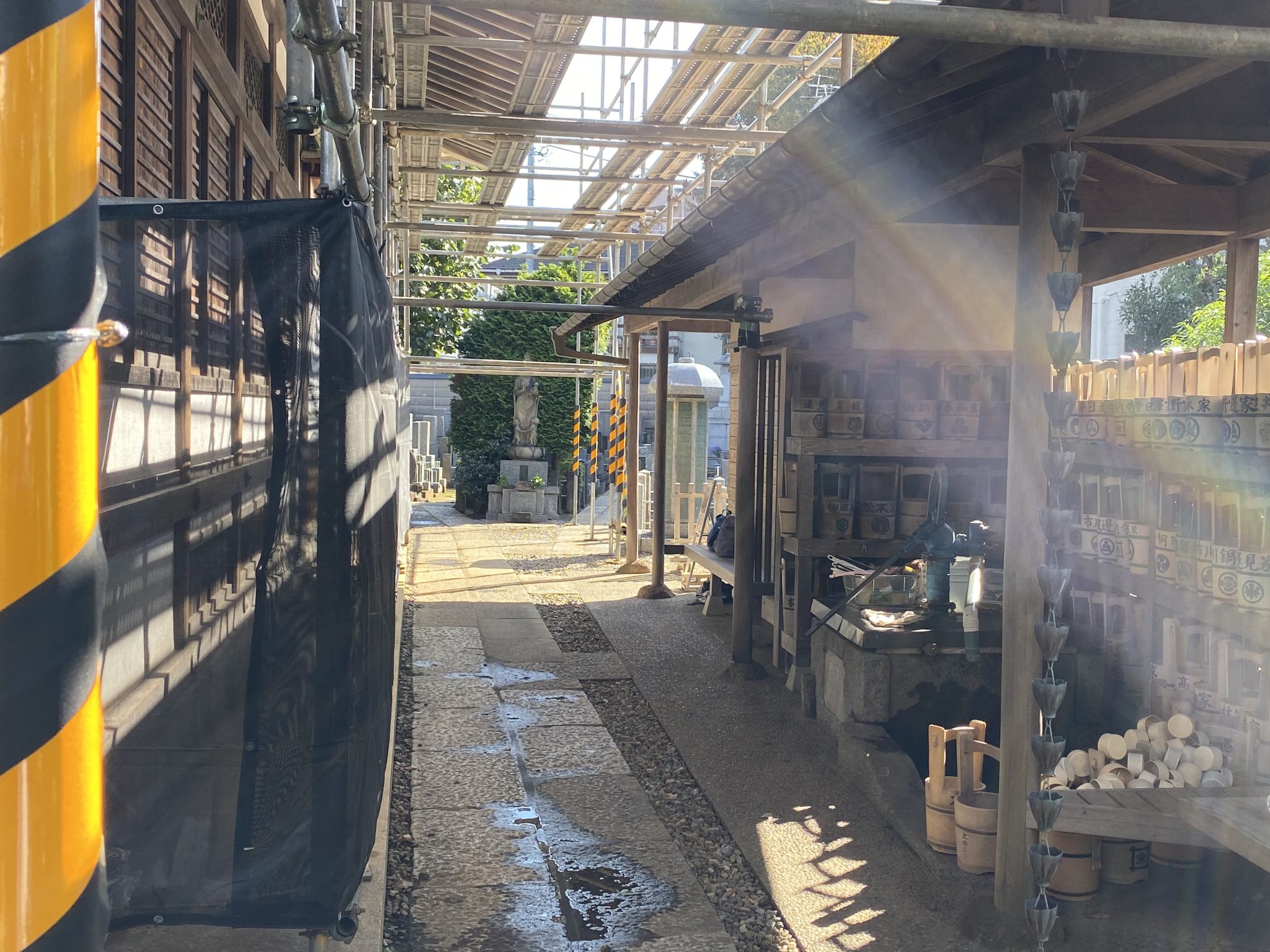 10月より瓦葺替工事がはじまりました。 しばらくの間、本堂を閉め、客殿書院二階を仮本堂としてご法事を行います。 また、本堂の周囲には足場が組まれており、お墓への通路の見通しが悪くなっております。お気をつけてお参りください。