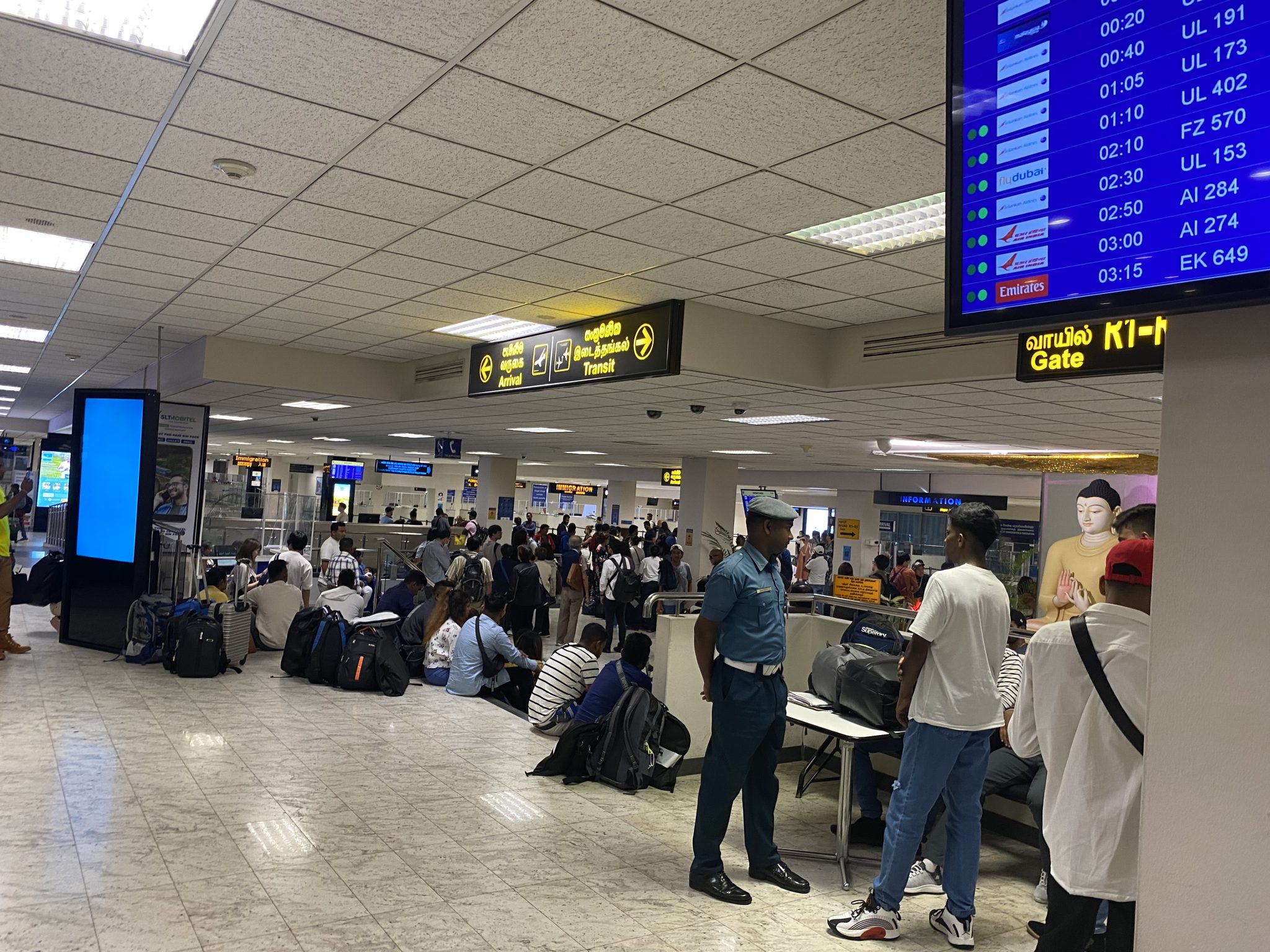 楽しかった旅もあとは日本に帰るだけとなりました。飛行機が離陸してしばらくすると「コロンボの空港に戻る」という機内アナウンスが・・・。結局スリランカの上空を3時間クルグルと旋回し、やっと着陸したかと思ったら機内で食事が配られ、機体から降ろしてもらえません。ようやく降ろされた乗客たちが待合ロビーで何があったんだろうと話していたところに、遅延の原因説明は一切ないまま、「再出発は12時間後の翌朝7時です」というアナウンスがありました。