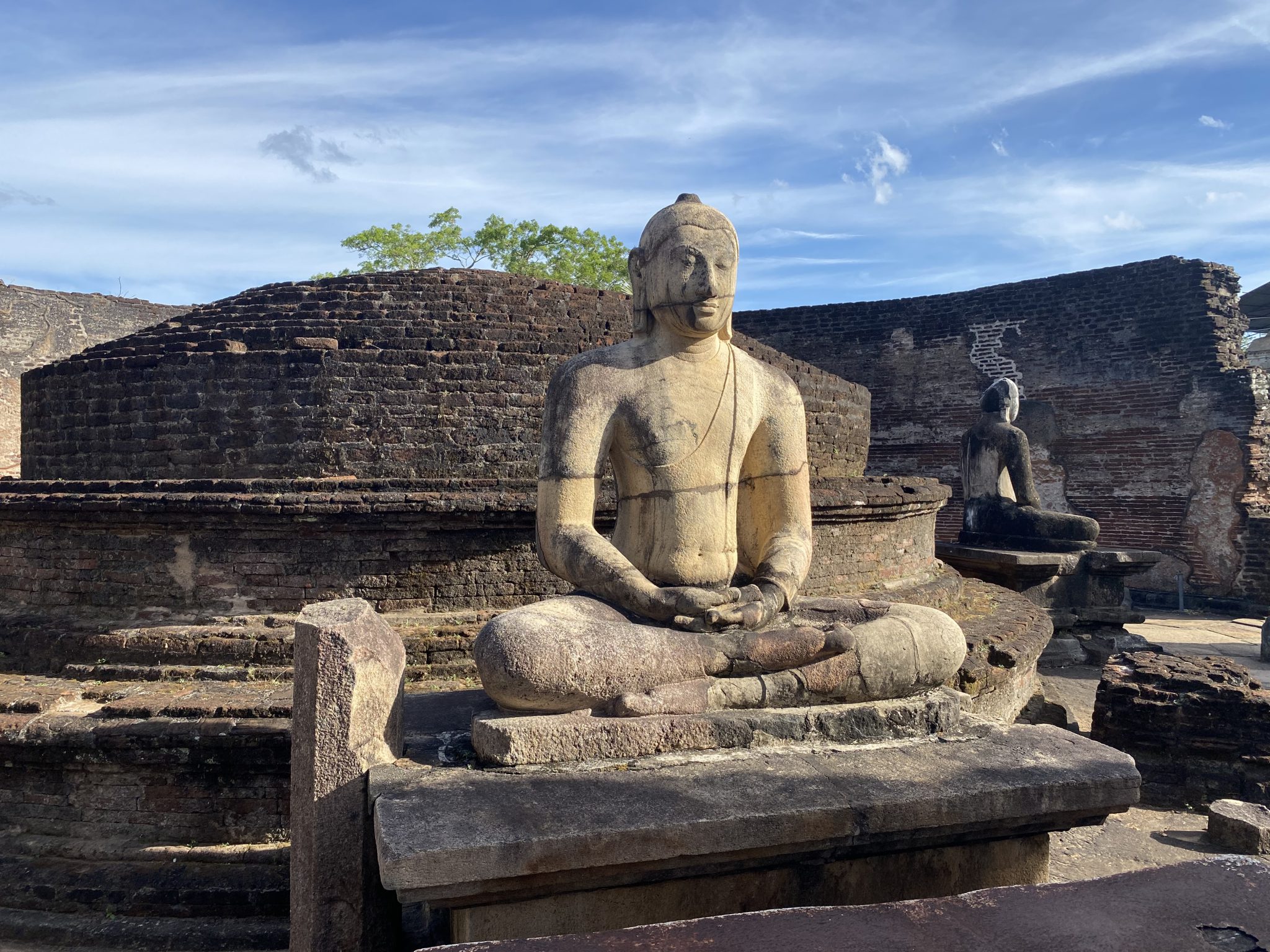 ※(1)インドのチョーラ王朝の侵略により首都のアヌラーダプラを追われたシンハラ王朝が、ポロンナルワに都を移したのが11世紀。12世紀に王位を継いだパラークラマ・バーフ1世は、巨大な灌漑用貯水池や城壁を築き、国を固め、また仏教に深く帰依し寺院や仏塔を次々に建立。ポロンナルワは仏教都市として繁栄を極め、仏教文化の華が開きました。その中でも仏教美術の傑作と称されるのが、ガル・ヴィハーラにある巨岩に刻まれた三体の仏像です。左から穏やかな表情で瞑想する釈迦坐像、悟りを開いた釈迦立像(涅槃に入る釈迦を悲しむ一番弟子のアーナンダとの説も)、そして長さ約15mもある巨大な釈迦涅槃像が並んでいます。なだらかな線で彫り出された姿態と柔和な表情の仏像の前に立つと、心穏やかな気持ちになるでしょう。また坐像と立像の間の仏龕(ぶつがん)にも、ブラフマーやヴィシュヌなどヒンドゥーの神々に囲まれた坐像が安置されています。その後ポロンナルワは13世紀に廃都となり、壮麗な建造物もジャングルに埋もれてしまいます。しかし19世紀に遺跡の発掘が始まり、今ではスリランカでも屈指の美しい古都として知られるようになりました。豊かな水をたたえた貯水池と数々の遺跡が、英明君主と称えられるパラークラマ・バーフ1世の時代へといざなってくれます。