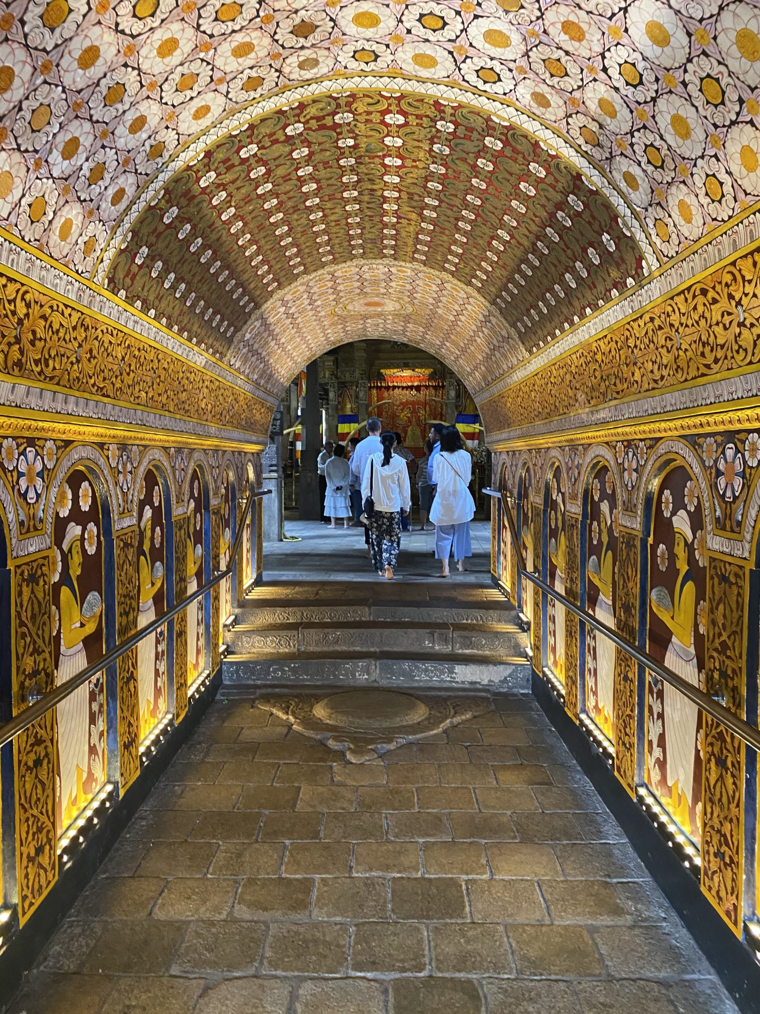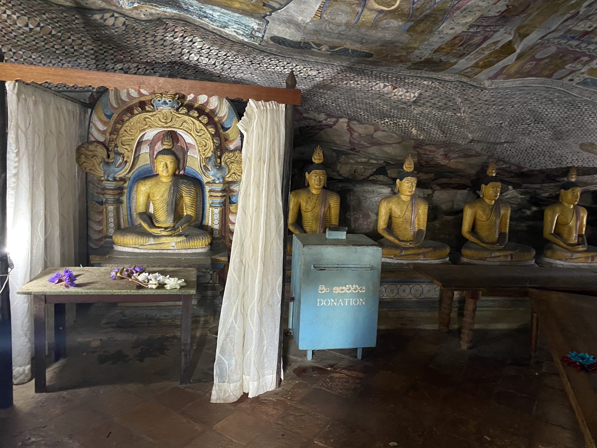 ※(2)窟内いっぱいに横たわる全長14mの涅槃仏で有名な第1窟。全身は金色ですが足の裏が赤く塗られています。これには釈迦が赤土の地を歩いてスリランカにやって来たという説が。ちなみに左右のつま先がほんの少し不揃いなのが涅槃仏、きれいに揃っているのは休息中のお姿なのだそう。最大規模の第2窟は壁や天井一面に描かれた壁画が圧巻。 仏画やスリランカの歴史画で埋め尽くされ、その総面積は2100㎡にも及びます。また、岩山の頂近くにも関わらず天井からしたたり落ちる水滴は涸れることなく、「ダンブッラ(水の湧き出る岩の意味)」の名の由来もここに。聖なる水として儀式などに使われています。第3窟から第5窟は18世紀から20世紀にかけて造営された比較的新しい窟。第3窟にも涅槃仏が安置されています。