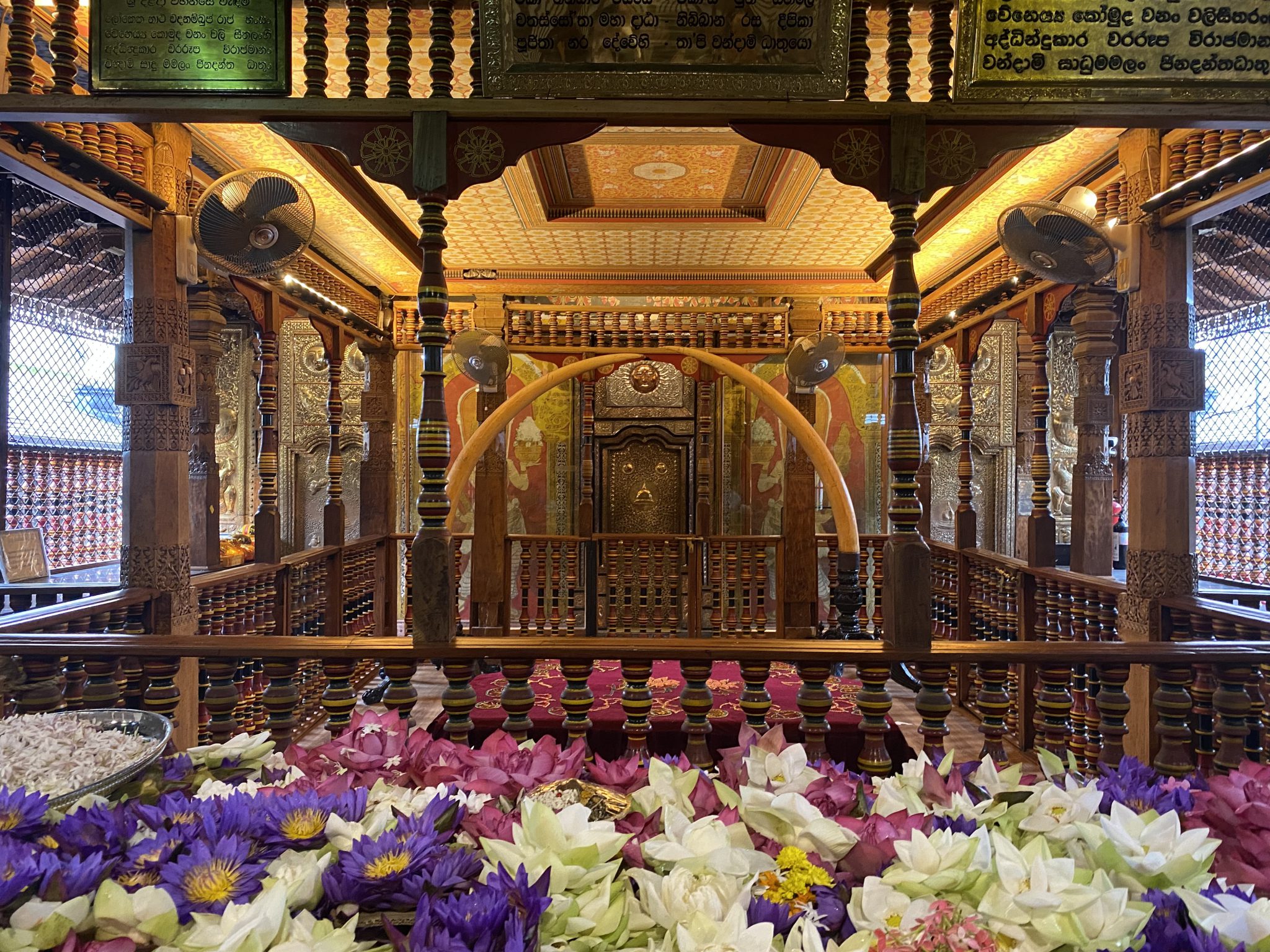 ※(3)4世紀にインドからもたらされた仏歯は、聖なる遺物として王家に受け継がれ、遷都とともに移され、最後にキャンディ湖畔に佇む仏歯寺に落ち着きました。仏歯は7重になった黄金の舎利容器に納められています。参拝者は日に三度のプージャ(礼拝)に列を作り、ほんの数分間小窓から見える舎利容器の姿を拝むのです。この仏歯を納めた舎利容器は年に一度、7~8月頃に開催されるペラヘラ祭りで外に持ち出されます。舎利容器を載せた聖なる象を中央に、各地から集められた百頭もの象や伝統的なキャンディアンダンスのパレードが練り歩き、街中が沸き返ります。
