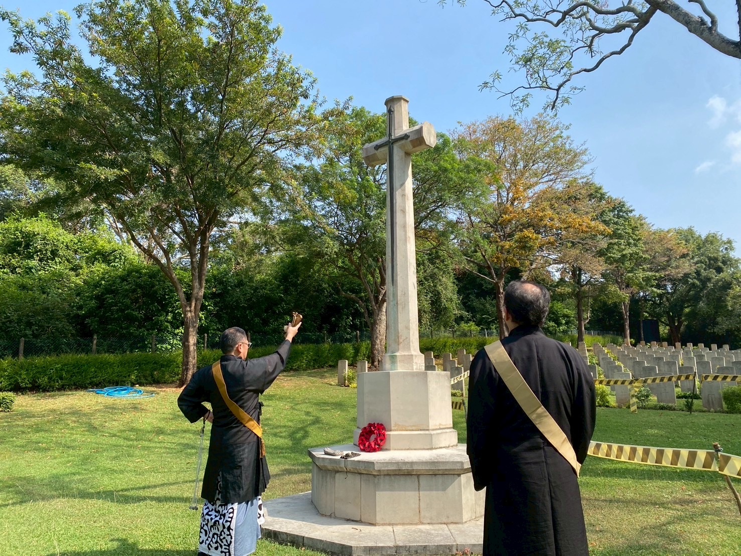 さらに旅の最後には、スリランカ東部の港町・トリンコマリーにある戦没者墓地を訪れ、慰霊法要を行いました。ここは第二次世界大戦中、英国海軍の基地が置かれ、日本軍による空襲が行われた歴史的な場所です。広々と整備された芝生のなかに並ぶ墓標と、中央に堂々と建つ慰霊碑の前に立ち、過去に思いを馳せながら静かに祈りを捧げました。